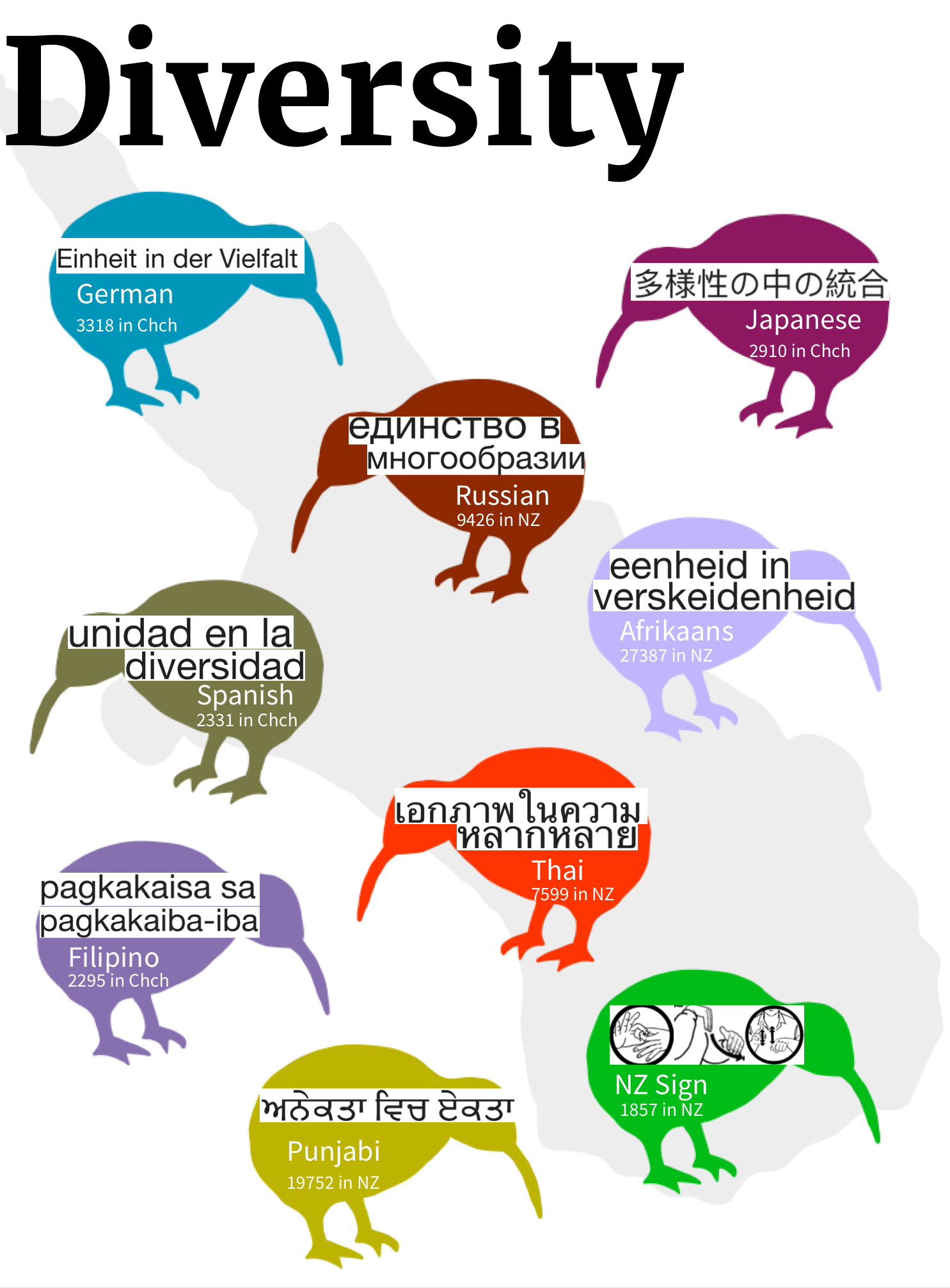 Most of the above translations of "Unity in Diversity" were done using Google Translate, and the newspaper unreservedly apologises for any unintentional error in grammar and meaning. The source of the statistics for the number of speakers in Christchurch and New Zealand is the City Council and the Office of Ethnic Communities respectively.